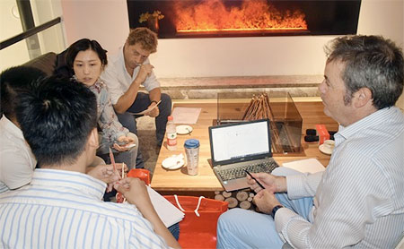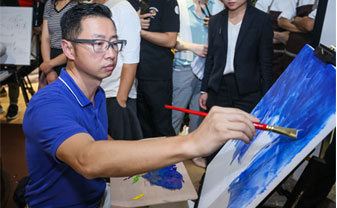 活動還特別設(shè)置了油畫創(chuàng)作環(huán)節(jié),讓設(shè)計師們在繁忙的工作之余獲得身心的愉悅。李鷹先生、伊瓦諾先生和藝術(shù)家CAMILO CADENA先生、郁一一女士藝術(shù)家圍坐在圓形壁爐上認真創(chuàng)作,仿佛置身于戶外大自然中,獲得了靈感與創(chuàng)意的來源。